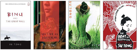 | Su Tong is known for his fascination with history and many of his works like (from left) Binu and the Great Wall, My Life as Emperor, Rice and The Boat to Redemption are set in the past. Photos Provided to China Daily |