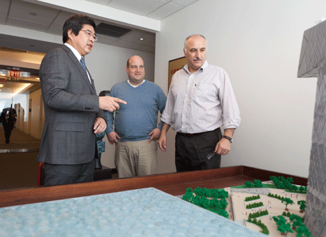 | Yuan Ning (left) talks to Joseph Catapano (middle), a project manager with China Construction America, and another colleague in front of the models of the headquarters of China Central Television and the Beijing National Aquatics Center at their Jersey City office in New York. [Sun Peng / China Daily] |