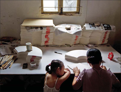 | A woman painting a paper folding fan at a Suzhou-based small workshop while her daughter sleeps beside her. A paper folding fan in the Ming Dynasty (1368-1644) style can cost as much as tens of thousands of yuan with customers mainly from China and Japan. Gao Erqiang / China Daily |