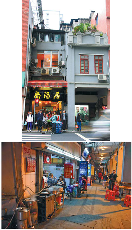 | Qilou is a straddling building with its ground floor opening for public access and upper floors reserved for residence (top). Walking along stores and restaurants inside a qilou offers a unique experience (above). Photos Provided to China Daily |