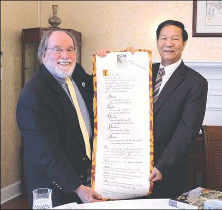 | Gubernatorial Guest Qiu Shaofang, China's consul general in Los Angeles, welcomes Hawaii Governor Neil Abercrombie at the diplomat's residence on Oct 19. Abercrombie told Qiu that Chinese tourism to Hawaii is on the rise. The island state is on pace to draw about 114,000 visitors from China this year. Los Angeles Provided to China Daily |
