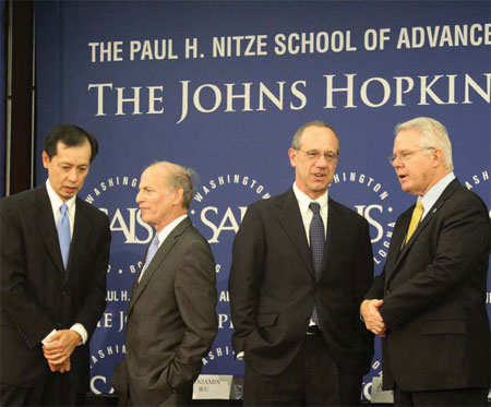 | Debate Prep China experts gathered for a panel discussion in conjunction with Monday's debate between US President Barack Obama and Republican Mitt Romney. Attendees of the event, which was hosted by Johns Hopkins University's Paul H Nitze School of Advanced International Studies and the Committee of 100, included, from left: Benjamin Wu, Committee of 100 vice-chairman; Jeffrey Bader, a national security adviser to the Obama campaign; Aaron Friedberg, an adviser to Romney on Asia-Pacific affairs; and David Lampton, director of the SAIS China studies program. Washington Sun Chenbei / China Daily |