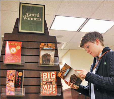 | Mo Takes Manhattan Natalie Pedersen, a marketing intern, reads a novel by Chinese writer Mo Yan, winner of the 2012 Nobel Prize in Literature, at a Barnes & Noble store in Manhattan. Several New York bookstores reportedly sold out of Mo Yan's books within two days of his Nobel win last week. This Barnes & Noble outlet replenished its stock of the writer's works this week and set up a special retail display including the novels Life and Death Are Wearing Me Out, The Republic of Wine, Shifu: You'll Do Anything for A Laugh and Big Breasts and Wide Hips. New York Yu Wei / China Daily |