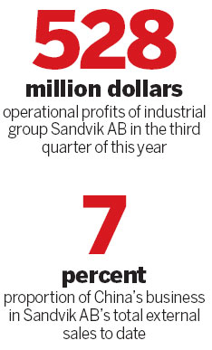 China is the fourth-largest market for Sandvik to date, accounting for 7 percent of the total external sales of the group. From 2002 to 2011, the average annual sales growth of Sandvik China was more than 25 percent, with total sales amounting to 7 billion yuan ($1.12 billion) last year. Now it has 65 offices and 15 manufacturing facilities in the nation.