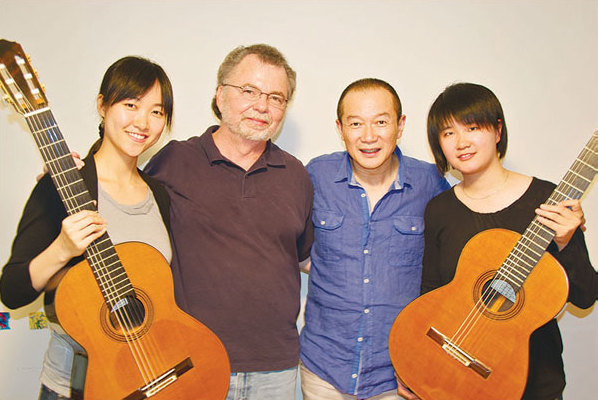 | The Beijing Guitar Duo - Su Meng and WangYameng - are joined by their former teacher Manuel Barrueco and Chinese composer Tan Dun before its New York concert. [Photo provided for China Daily] |