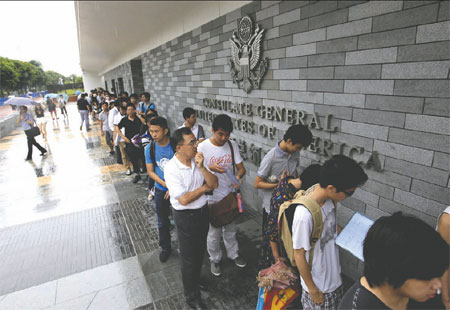 | Chinese citizens line up to attend visa application interviews outside the US general consulate in Guangzhou on Wednesday. The new consulate building, the second US government facility built in China after the embassy in Beijing, was put into use on Tuesday. Zou Zhongpin / China Daily |