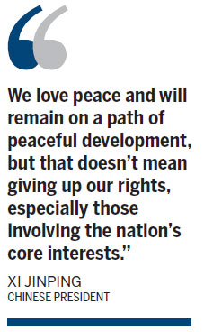 "We love peace and will remain on a path of peaceful development, but that doesn't mean giving up our rights, especially those involving the nation's core interests," Xi said.