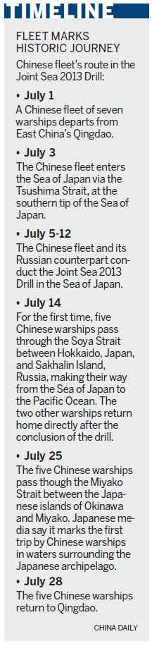 On July 25, the ships crossed the Miyako Strait between Japan's Miyako and Okinawa islands on their return voyage to Qingdao, headquarters of the North China Sea Fleet. The move marks the first trip by the Chinese navy circumnavigating the Japanese archipelago.