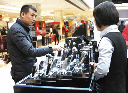 | A male customer examines an electric shaver in an appliance store. Provided to China Daily |