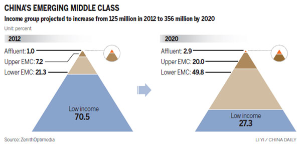 According to the Discover China's Emerging Middle Class survey released by ZenithOptimedia, China's emerging urban middle class totaled 125 million in 2012, and the number is expected to reach 356 million by 2020.