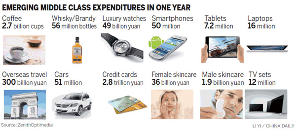 The middle class is said to be spearheading that consumption. Not only does this group have a better understanding of brands, but ZenithOptimedia said its members are enthusiastic consumers. The luxury watches they buy each year are worth an estimated 49 billion yuan. They reportedly consume 2.7 billion cups of coffee and buy 5.1 million cars a year. And the amount they spend on travel will soon reach 300 billion yuan annually.
