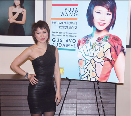 | Pianist Yuja Wang at a press event Wednesday after performing to a sold-out crowd in Avery Fisher Hall at Lincoln Center on Monday. Wang will be performing in Boston at the end of March before heading to Europe for the remainder of her 2013-2014 tour. Amy He / China Daily |