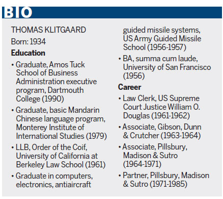 At the time, Klitgaard, then an attorney and partner at Pillsbury, Madison & Sutro, was one of the first Americans who went to Shanghai with US Senator (then Mayor) Dianne Feinstein in 1980 to establish a sister-city relationship between Shanghai and San Francisco, only a few months after the US and China normalized diplomatic relations.