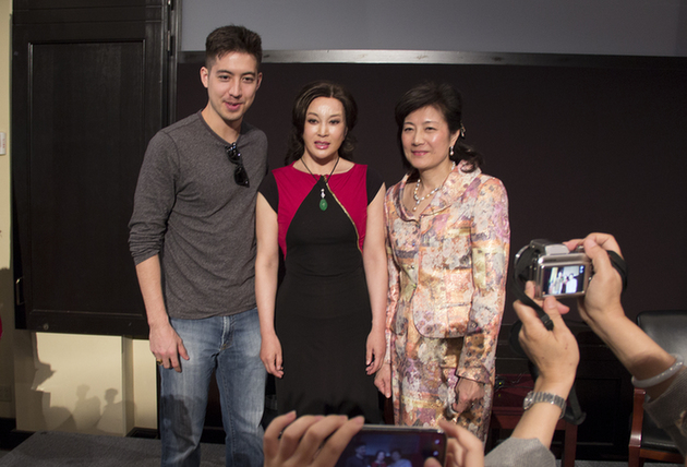 | Chinese actress Liu Xiaoqing (center) met with former colleague Lily Chen Foster and her son Zachery Foster at Rice University on Thursday. May Zhou / China Daily |