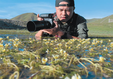 | Xu Jian lies prostrate to photograph flowering water buttercups during a survey in Qinghai province by Imaging Biodiversity Expedition Inc. Dong Lei / For China Daily |