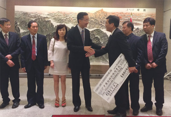 | New York: Generous donation Sun Guoxiang (center), the Chinese consul general in New York, shakes hands with a representative from the Fuzhou Langqi Association Inc USA. Fuzhou Langqi made a donation to help the victims of the recent Yunnan earthquake at the office of the Consulate General of China in New York on Thursday. Twenty-four community organizations, companies and individuals donated nearly $240,000 to the relief efforts. Elizabeth Wu / For China Daily |