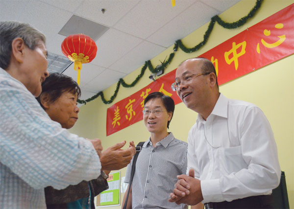 | Gaithersburg, Maryland: Senior power Zhang Yi (right), counselor and deputy consul general of the Chinese embassy, and Meng Fang (second from right), first secretary and consul, talk with senior citizens at the Chinese Culture and Community Service Center in Gaithersburg, Maryland, on Thursday after hundreds of senior citizens donated money to help victims affected by the earthquake in Yunnan province. Liu Chang / China Daily |
