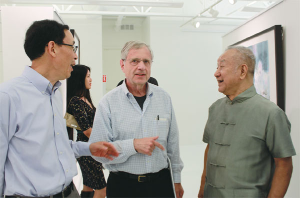 | San Francisco: Modern master NanHai Art Center hosted an exhibition of the works of artist Liu Guosong and eight of his students in Millbrae on Aug 9. Liu is considered one of the most important advocates and practitioners of modern Chinese painting. From left: Yang Xiaoneng, Chinese archaeologist and art historian; David Menke, art collector; and Liu Guosong. Qidong Zhang / China Daily |