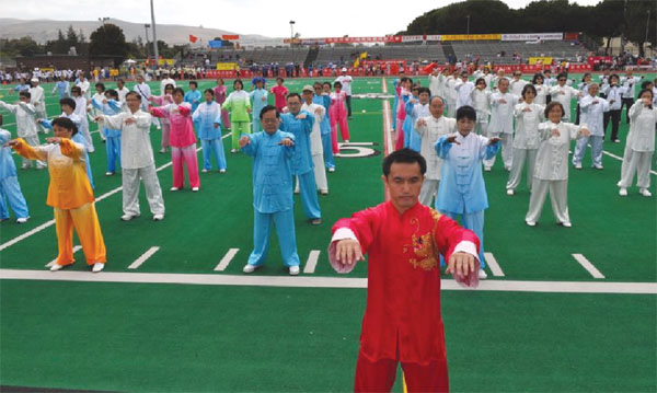 | Union City, CA: Mass exercise More than 200 people perform tai chi during the opening ceremony for the 2014 Chinese-American Olympics of Northern California in Union City, California, at James Logan High School Stadium on Aug 9. Lian Zi / China Daily |