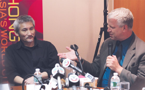New York: Moving topics David Schwartz (right), chief curator at the Museum of the Moving Image, speaks with Hong Kong director Tsui Hark about his work at a press event on Thursday. Tsui will be presenting director Patrick Lung Kong with a Lifetime Achievement Award for his work, nine films of which will be screened at the Museum of the Moving Image. Amy He / China Daily |