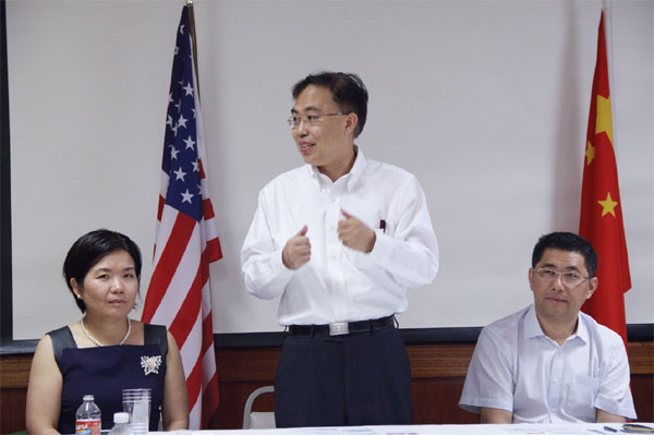 Houston: Talent scouts Huo Jiazhen (center), dean of the School of Economics and Management at Tongji University, speaks at a recruiting event held at the office of the Consulate General of China in Houston on Aug 8. On the right is Lu Peiming, vice-president of Tongji University, and on the left is Zhang Yan, professor from the Jones Graduate School of Business at Rice University. May Zhou / China Daily |