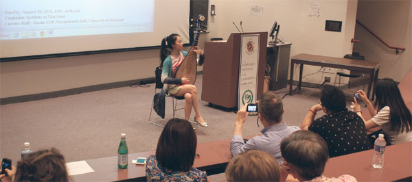 | College Park, Maryland: Pipa perfect Zhao Cong, primary pipa soloist for the China National Orchestra in Beijing, demonstrates the pipa during a lecture she gave at the University of Maryland on Aug 10 in College Park, Maryland. The event is sponsored by the university's Confucius Institute. The pipa is a four-stringed Chinese lute. Cui Jianxin / For China Daily |