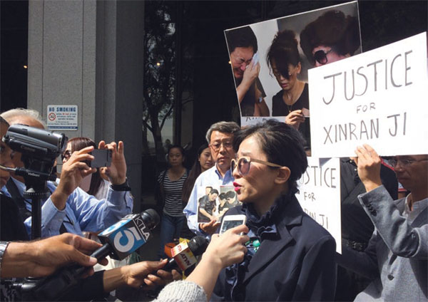 | Los Angeles: Legal remedy Rose Wen-Huei Tsai (center), attorney for Chinese student Ji Xinaran's family, speaks with reporters outside the courtroom after the second public hearing of Ji's murder trial on Tuesday in Los Angeles. Tsai said that legal punishment is the only way to prevent this kind of crime from ever happening again. Huang Xilin / For China Daily |