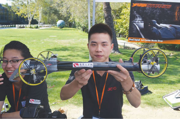 | Pasadena, CA: A new twist Zhao Wei, designer of the rubber band-powered racing car Team Bee from Beijing University of Technology, shows off his car at the 2014 Formula E Race hosted by the Art Center College of Design in Pasadena on Aug 7. Cindy Liu / China Daily |