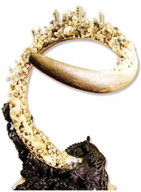 Glistening white mammoth tusks stretched from spotlighted pedestals around the convention hall. Intricate Buddhas, mythological figures, maidens and wildlife emerged from the enormous specimens. More than 300 pieces appeared on display.