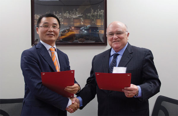 | Get a grip Wang Zhuoyan (left), executive vice-president of HQC, shakes hands with Robert Kelly, managing director of DKRW Energy LLC, after signing a business cooperation agreement. |