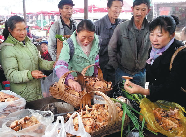| Shoppers pick out wild mushrooms at a farmers' market in Zhaotong, Yunnan province, in October. Yan Keren / For China Daily |