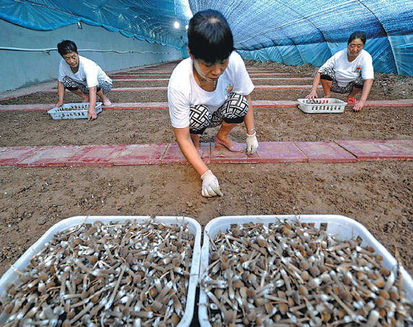 | Farmers pick termite mushrooms in Bazhou, Hebei province, in July 2014. Li Xiaoguo / Xinhua |