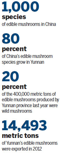China has more than 1,000 species of edible mushroom, with about 80 percent of them growing in Yunnan, said Liu Peigui, a researcher at the Chinese Academy of Sciences' Kunming Institute of Botany.