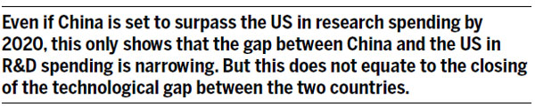 Even if China is set to surpass the US in research spending by 2020, this only shows that the gap between China and the US in R&D spending is narrowing. But this does not equate to the closing of the technological gap between the two countries. Technological advancement is a gradual and long-term process of knowledge accumulation, which requires a sustainable approach to investment designed to enhance an economy's capacity to innovate.