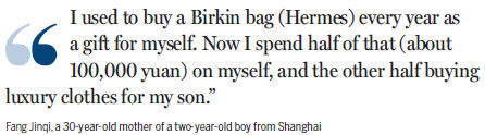 "I used to buy a Birkin bag (Hermes) every year as a gift for myself," said Fang Jinqi, a 30-year-old mother of a two-year-old boy from Shanghai. "Now I spend half of that (about 100,000 yuan) on myself, and the other half buying luxury clothes for my son."