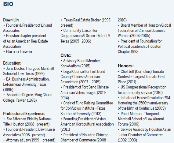Early this year, Lin became the Houston chapter president of the Asian-American Real Estate Association.