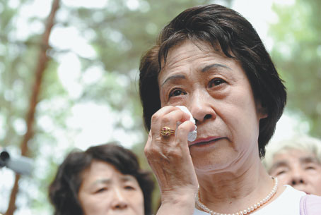 | Sumie Ikeda sheds tears as she leads a group of Japanese citizens on a visit to the graves of their adoptive Chinese parents in Fangzheng, Heilongjiang province, in July. Wang Kai / Xinhua |
