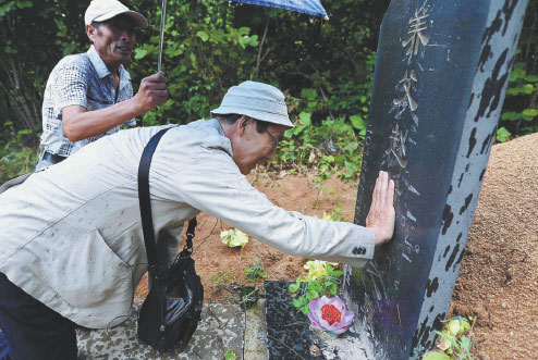 | Chen Qinghe, a 73-year-old Japanese man abandoned by his parents during the hasty retreat at the end of World War II, kneels and weeps at the grave of his adoptive Chinese parents in Mudanjiang, Heilongjiang province, on Aug 11. Wang Kai / Xinhua |