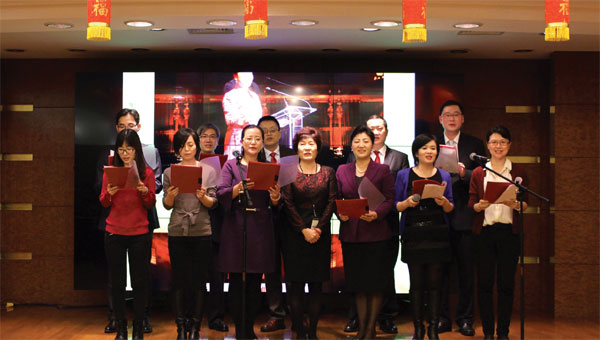 | Sing along - New York Consul General Zhang Qiyue (front row, center) and Deputy Consul General Zhang Meifang (front row, third from right) of the Chinese Consulate General in New York, sing Tong Yi Shou Ge (The Same Song) with staff members of the consulate's press and public affairs office at a New Year's reception for members of the media held at the consulate on Dec 15. Hong Xiao / China Daily |