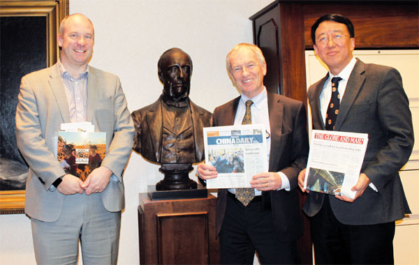 | China Daily and The Globe and Mail - Toronto Phillip Crawley (center), publisher and CEO of The Globe and Mail; David Walmsley (left) editor-in-chief of The Globe and Mail; and Larry Lee, president and editor-in-chief of China Daily USA, pose beside a statue of George Brown on Monday in Toronto. Na Li / China Daily |