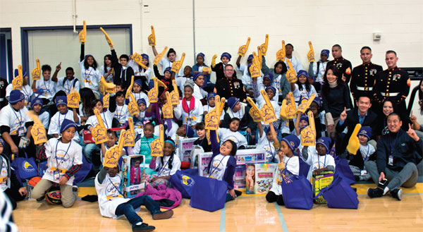 | All number 1 - Los Angeles East West Bank joined the Los Angeles Lakers to celebrate an early Christmas on Dec 16 with 60 underserved kids from "School on Wheels" in Los Angeles County at Toyota Sports Center, which is also Lakers' training center. Provided to China Daily |