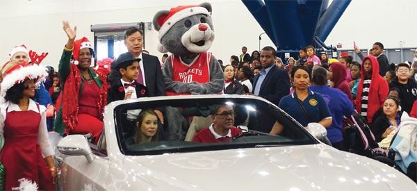 | Fun for kids - Houston Chinese Consul General Li Qiangmin (next to Houston Rockets mascot) and Congresswoman Sheila Jackson Lee (second from left) ride in the parade car on Dec 19 at the holiday toy drive for kids in downtown Houston. The event was initiated by Lee to bring cheers to kids in need. Provided to China Daily |