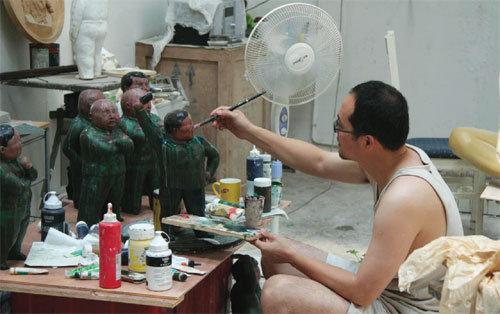 | Qu Guangci works on the group sculpture Knife Gang. Photos provided to China Daily |