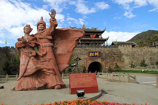 | Statues of ancient Tibetan king Songtsen Gampo and the princess guard the old city gate of Songpan in Sichuan province.[Photo provided to China Daily] |