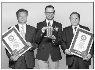 | Tan Yue of China Publishing Group (left), and Yu Dianli of The Commercial Press (right), receive awards in London on Tuesday from Marco Frigatti of Guinness World Records. Xinhua |
