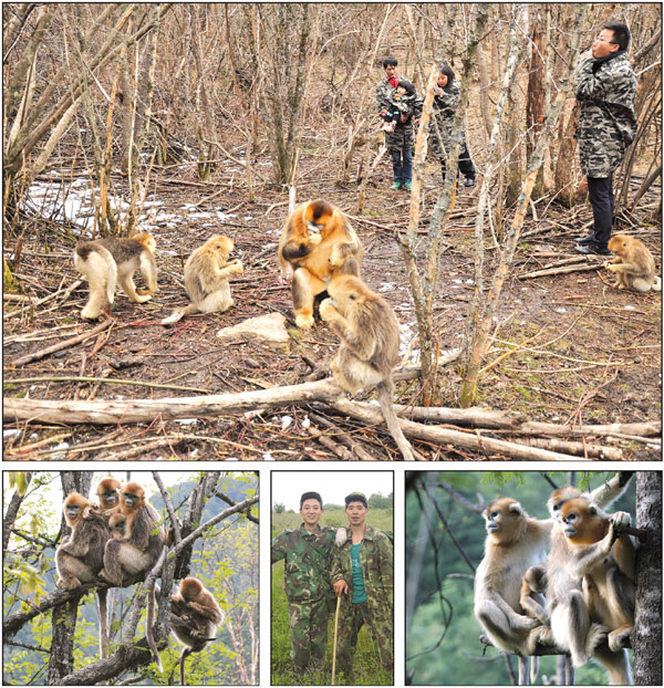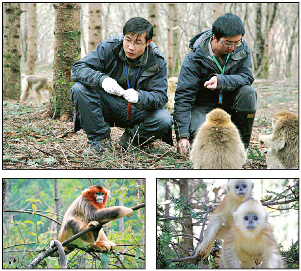 | The golden snub-nosed monkeys in Shennongjia, once elusive animals, are now comfortable with intimate contacts with researchers after years of food offering programs in winter. Above: Huang Yuanpeng (left) with a colleague. Top photo by Liu Xiangrui / China Daily; below photos provided to China Daily |