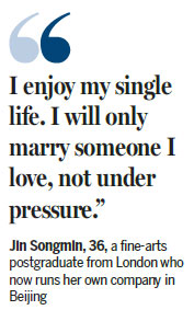 Jin Songmin, 36, invited her parents to Beijing instead of going back home to Hebei province for the usually weeklong festival holiday this year. Her parents not only understand that she is busy and under a great deal of work pressure, but they also rarely bring up the topic of marriage before her.