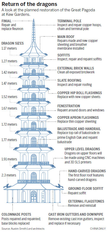 The restoration draws on the similarities between the Kew pagoda and Nanjing's Porcelain Pagoda, which is believed to have inspired English architect Sir William Chambers when he designed the Great Pagoda in the 18th century.