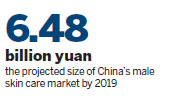Based on a report by Chinese firm Zhiyan Consulting, the market size of the Chinese mainland male skin care and makeup market was worth 5.01 billion yuan ($752 million) in 2016, up from 2.06 billion yuan in 2010. The market is also set to burgeon to 6.48 billion yuan in 2019.