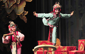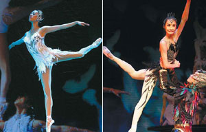 Aballerina performs a pirouette on her partner's shoulder - and then another on his head. This is an iconic scene from the version of Swan Lake the Guangdong Acrobatic Troupe of China premiered in 2005.